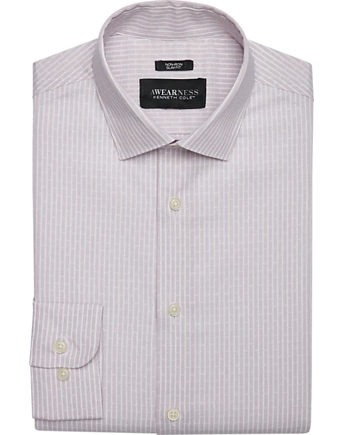 Look your very best with this stylish dress shirt by Awearness Kenneth Cole. This shirt keeps you comfortable in fine cotton blend fabric with a touch of stretch. Comfortable and in an slim fit, this dress shirt has a spread collar and smooth, no pocket front. Classic features are found here detailed with a rich burgundy stripe and a spread collar. Slim Fit is slim and tapered across the chest, shoulders, armholes, waist and sleeves without compromising on comfort. Recommended for more triangle body types (broad shoulder and chest, narrow waist and hips).