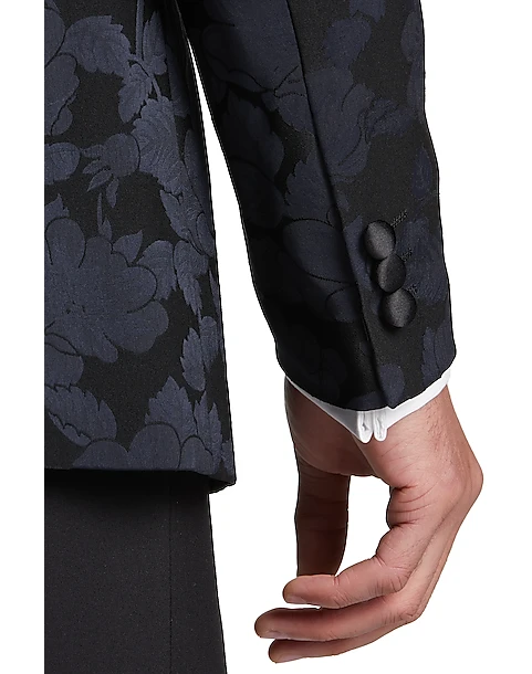 Create a memorable and stylish formal wear look with this deep, dark, richly patterned jacket by Egara. This one-button formal jacket features a smooth satin peak lapel and besom pockets.