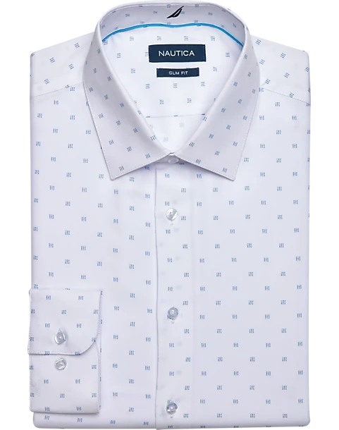 Designed to flex with your every move, this dress shirt from Nautica is made from a comfortable fabric blend with four-way stretch. A Slim Fit gives it a modern silhouette that trims and tones. Slim Fit is slim and tapered across the chest, shoulders, armholes, waist and sleeves without compromising on comfort. Recommended for more triangle body types (broad shoulder and chest, narrow waist and hips).