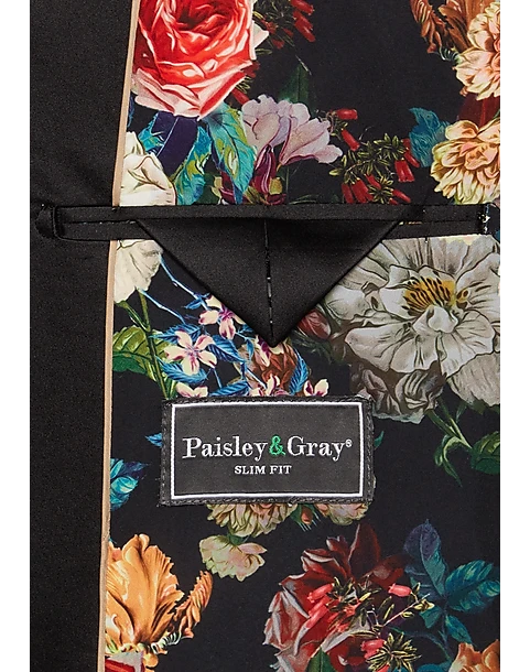 - Polyester blend|Double breasted|Satin peak label|Side vents|Slim Fit|Paisley & Gray|