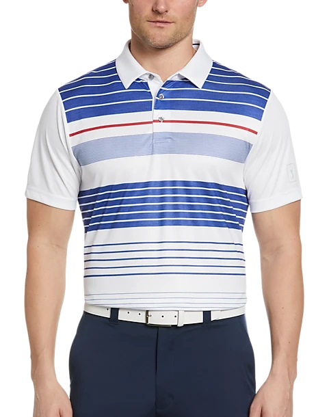 Get energized on and off the course with this sporty and stylish printed polo from PGA TOUR. Interlock knit fabric provides plenty of stretch so you can perfect your swing.