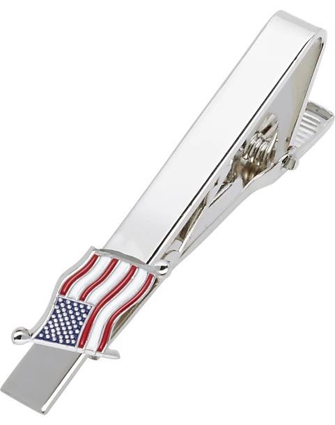 Used to fasten a tie to a dress shirt this silvertone tie bar features an American flag detail. It provides a refined touch to any business ensemble.